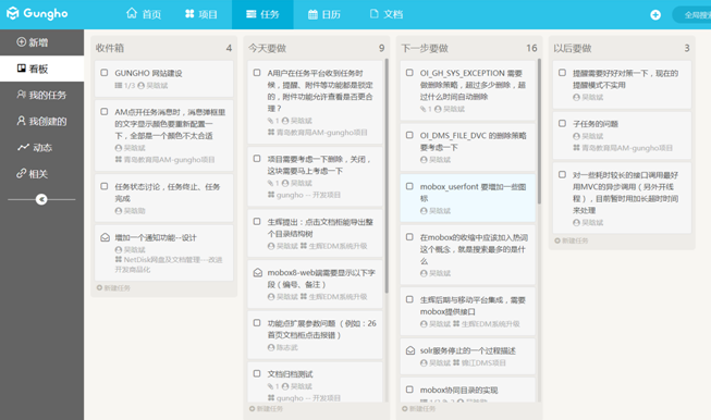 任務看板里出現的任務均是操作者需要處理的任務,看板的目的在給這些要處理的任務簡單做一個計劃,比如A任務今天做,B任務下一步做,C任務以后做,不需要你明確到具體日期只是做一個大概的規劃。因此在任務看板中我們看到的是4個泳道。