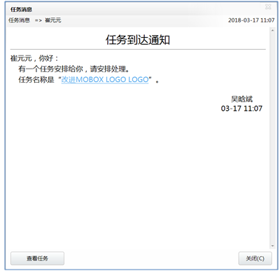 任務(wù)創(chuàng)建后系統(tǒng)把任務(wù)到達(dá)通知執(zhí)行人,如果你安裝過AM系統(tǒng),AM系統(tǒng)會(huì)在第一時(shí)間給執(zhí)行人發(fā)一個(gè)任務(wù)到達(dá)消息,點(diǎn)開AM消息即可查看任務(wù),并確認(rèn)是否執(zhí)行,具體操作如下: