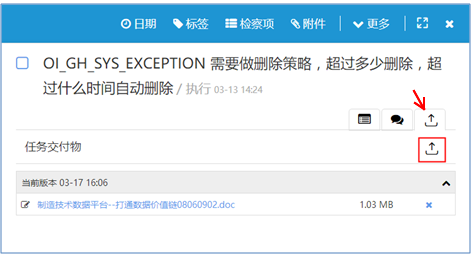 點(diǎn)上圖中的紅色框線區(qū)域的“上傳”按鈕即可選擇文件進(jìn)行上傳,上傳成功后會(huì)在任務(wù)交付物 列表中顯示。 如果要?jiǎng)h除交付文件,點(diǎn)擊交付文件后面的“刪除”按鈕。