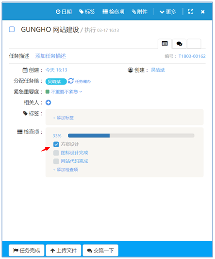 如果任務(wù)在創(chuàng)建時(shí)有設(shè)置過檢查點(diǎn),任務(wù)執(zhí)行人可以在任務(wù)顯示頁面中通過任務(wù)檢查點(diǎn)來設(shè)置任務(wù)進(jìn)度,如下圖紅色箭頭指處所示: