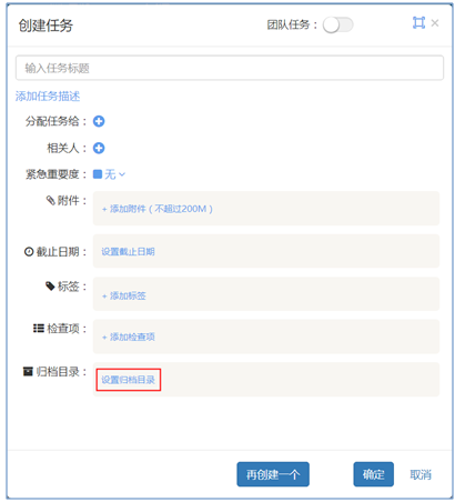在項(xiàng)目中創(chuàng)建任務(wù),系統(tǒng)彈出的創(chuàng)建任務(wù)彈框會(huì)比平常任務(wù)創(chuàng)建彈框多一個(gè)歸檔目錄設(shè)置,如下圖紅色框線區(qū)域所示。