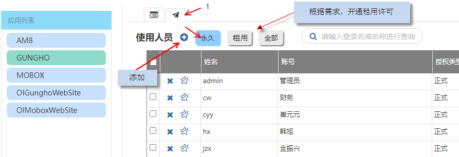 所以:只要授權里面包含租用授權,一旦有效期到期,后面若有新加入的賬號要使用此系統。就必須手工先將這個賬號添加到永久授權里面,或者將租用許可有效期改長,才能登錄