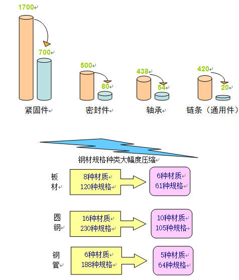 下圖是國內(nèi)某叉車集團(tuán)在實(shí)施PDM系統(tǒng)前后對(duì)標(biāo)準(zhǔn)件、通用件、材料規(guī)格數(shù)量的一個(gè)對(duì)比。