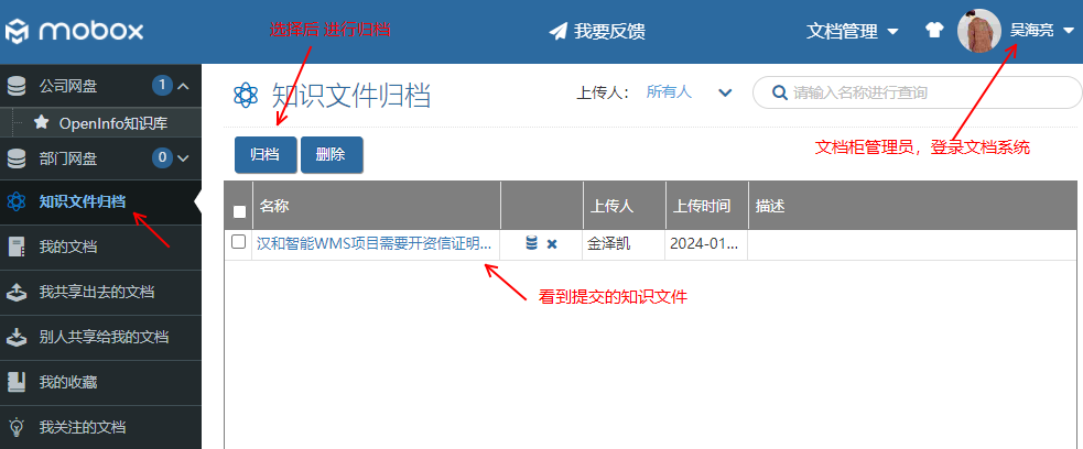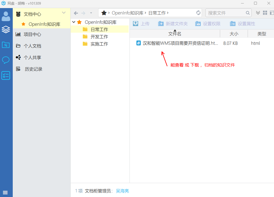 歸檔后,對文檔柜有權(quán)限的用戶就能通過文檔系統(tǒng)下載或瀏覽這些知識文件